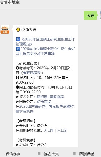 温馨提示:微信搜索公众号【淄博本地宝】,关注后在对话框回复【考研】可获2026考研报名入口、报名流程、成绩查询入口、全国近5年考研分数线、近3年复试分数线汇总、院校库、专业库等。